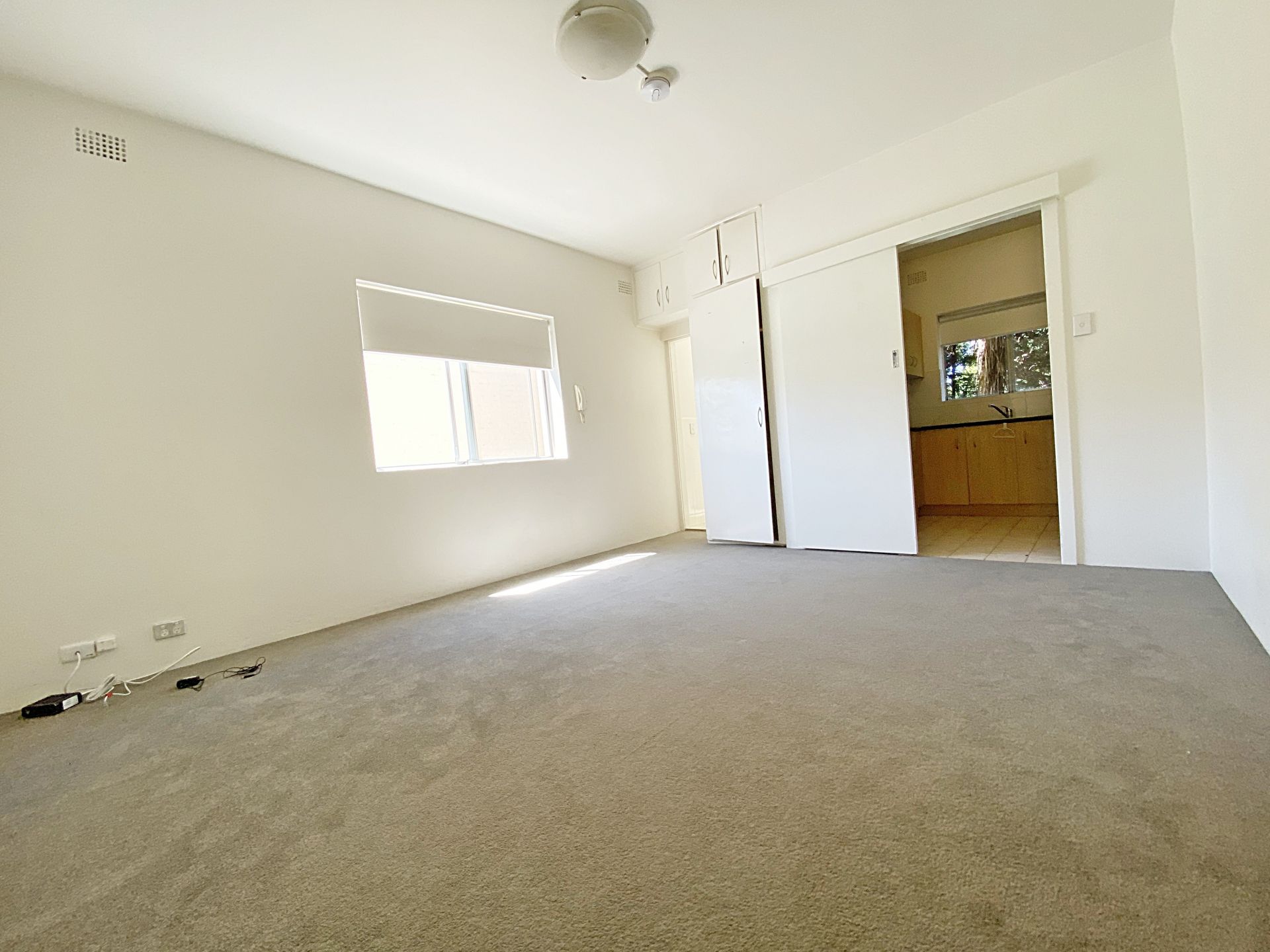 - Living/bedroom with storage cupboard; separate kitchen