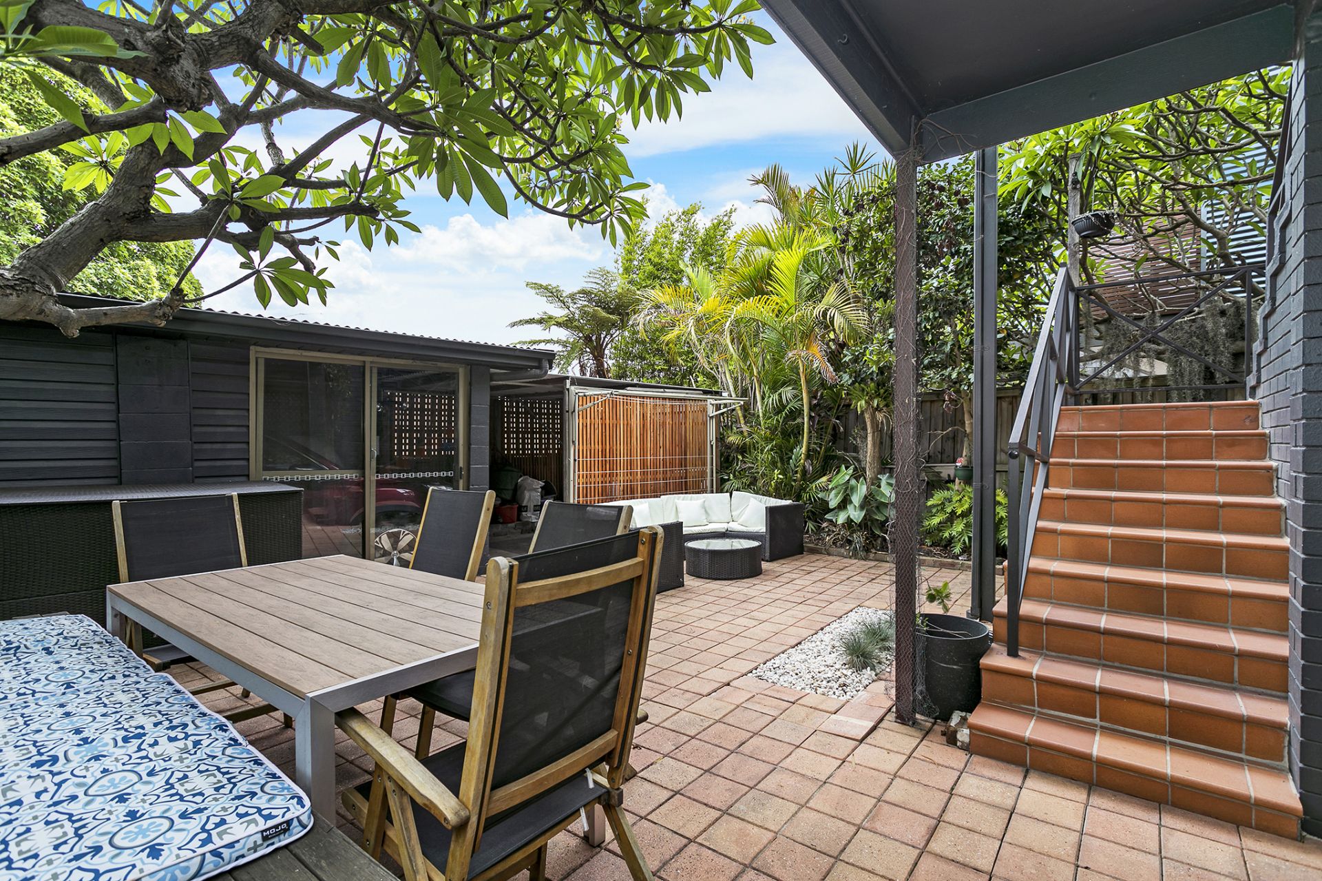 Private backyard with paved entertainment patio and peaceful leafy surrounds