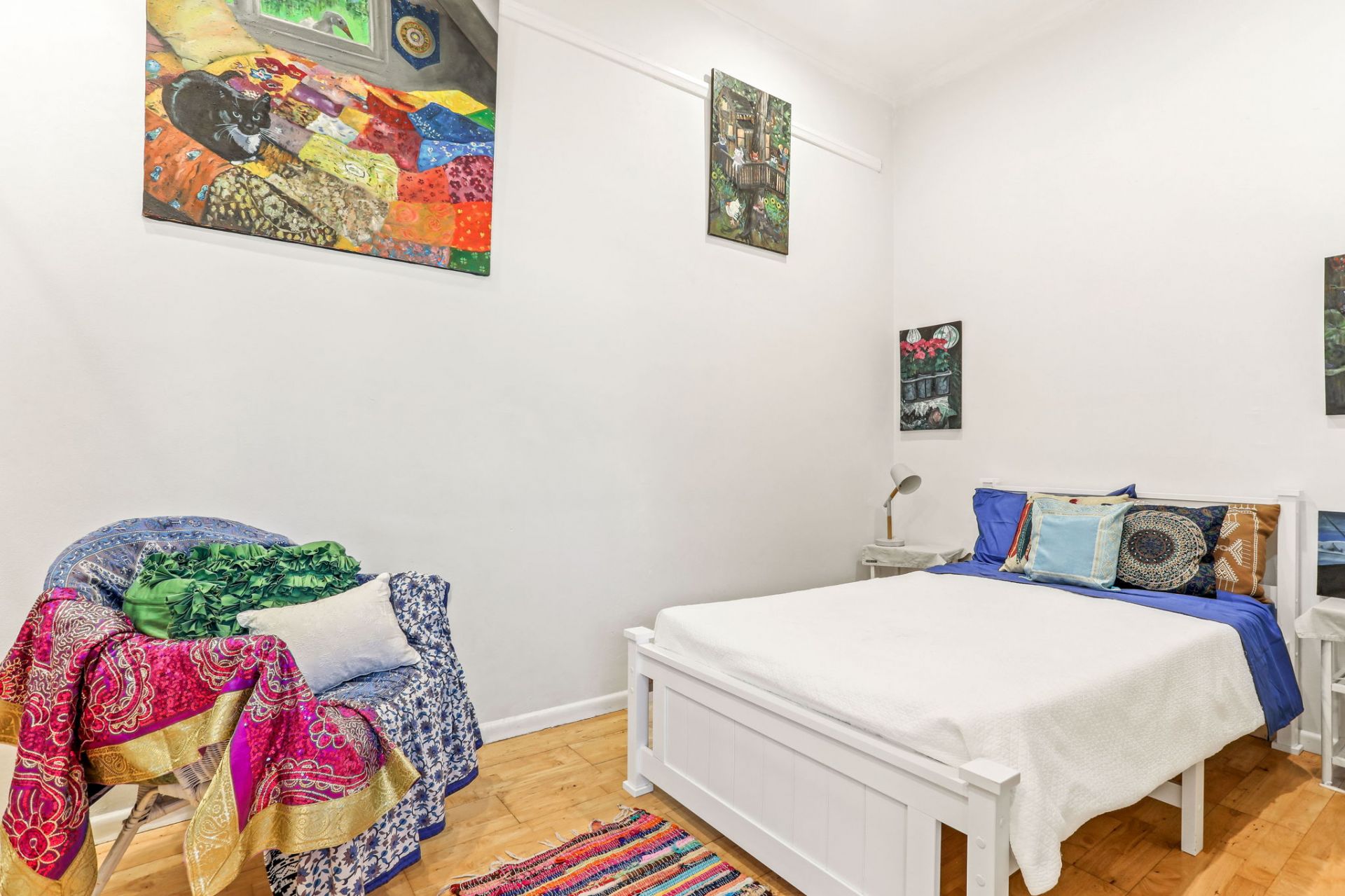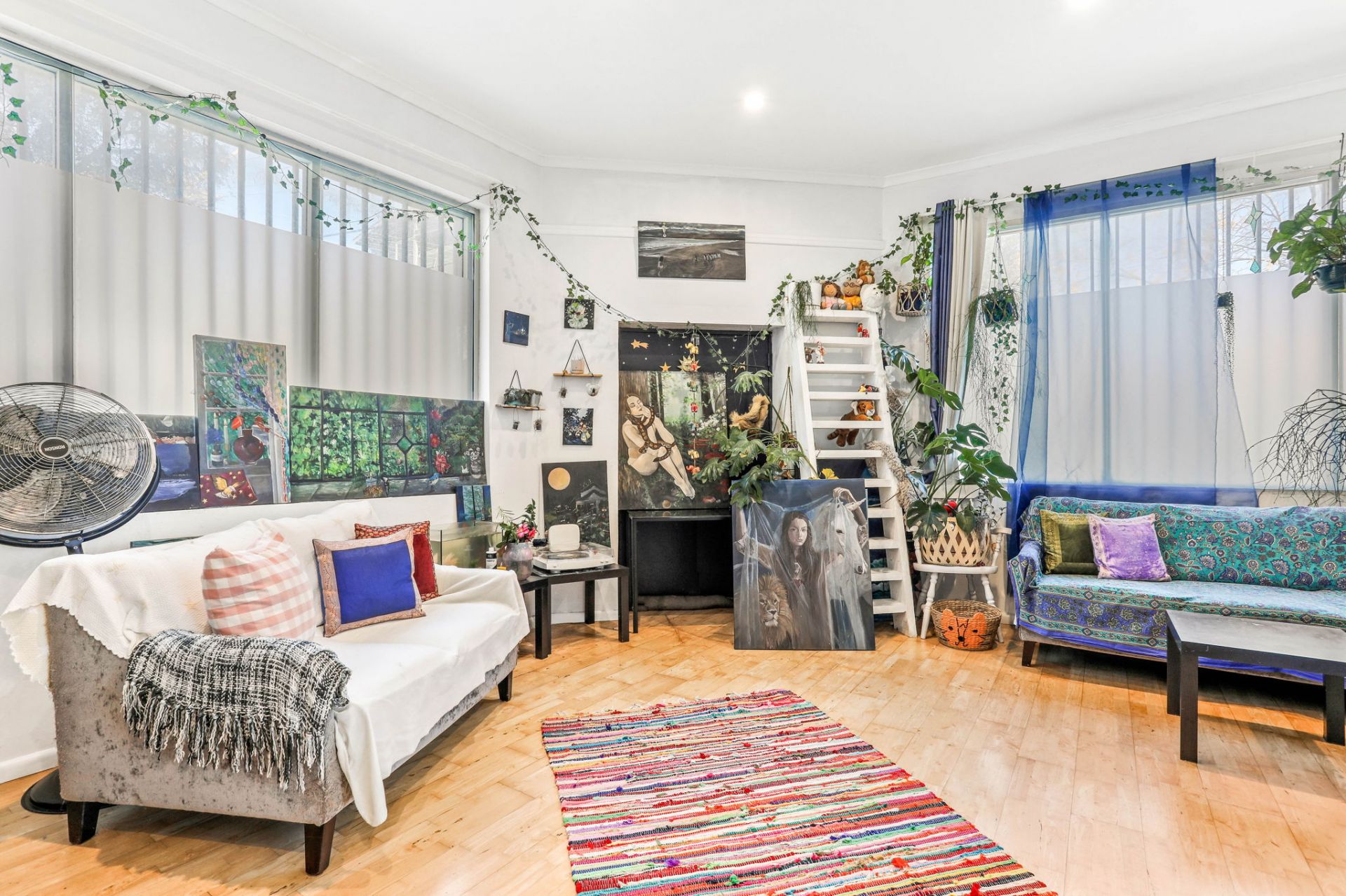 Bright living space with 14-foot ceilings, polished floors and picture rails